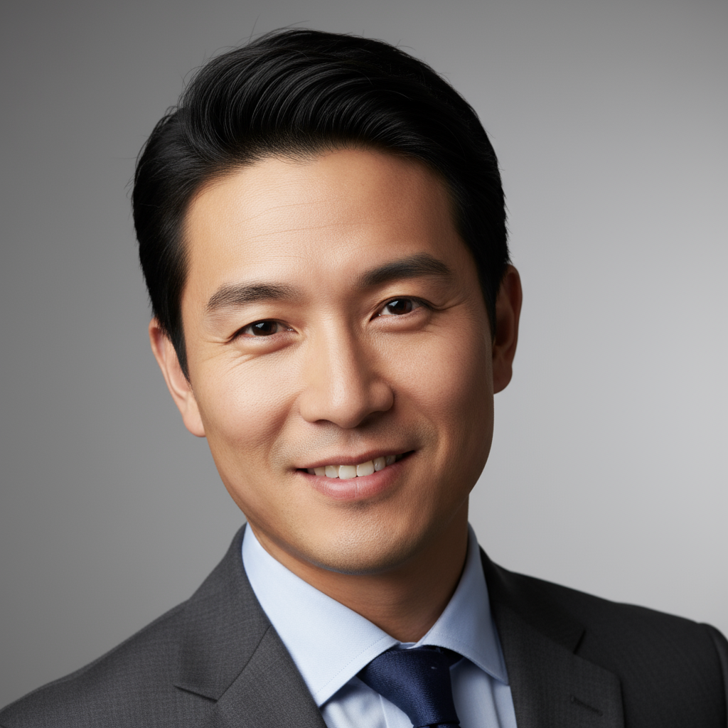 Professional headshot of Asian man with short black hair in charcoal suit with warm smile