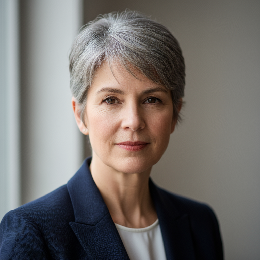 Professional headshot of middle-aged man with gray hair in navy suit smiling confidently